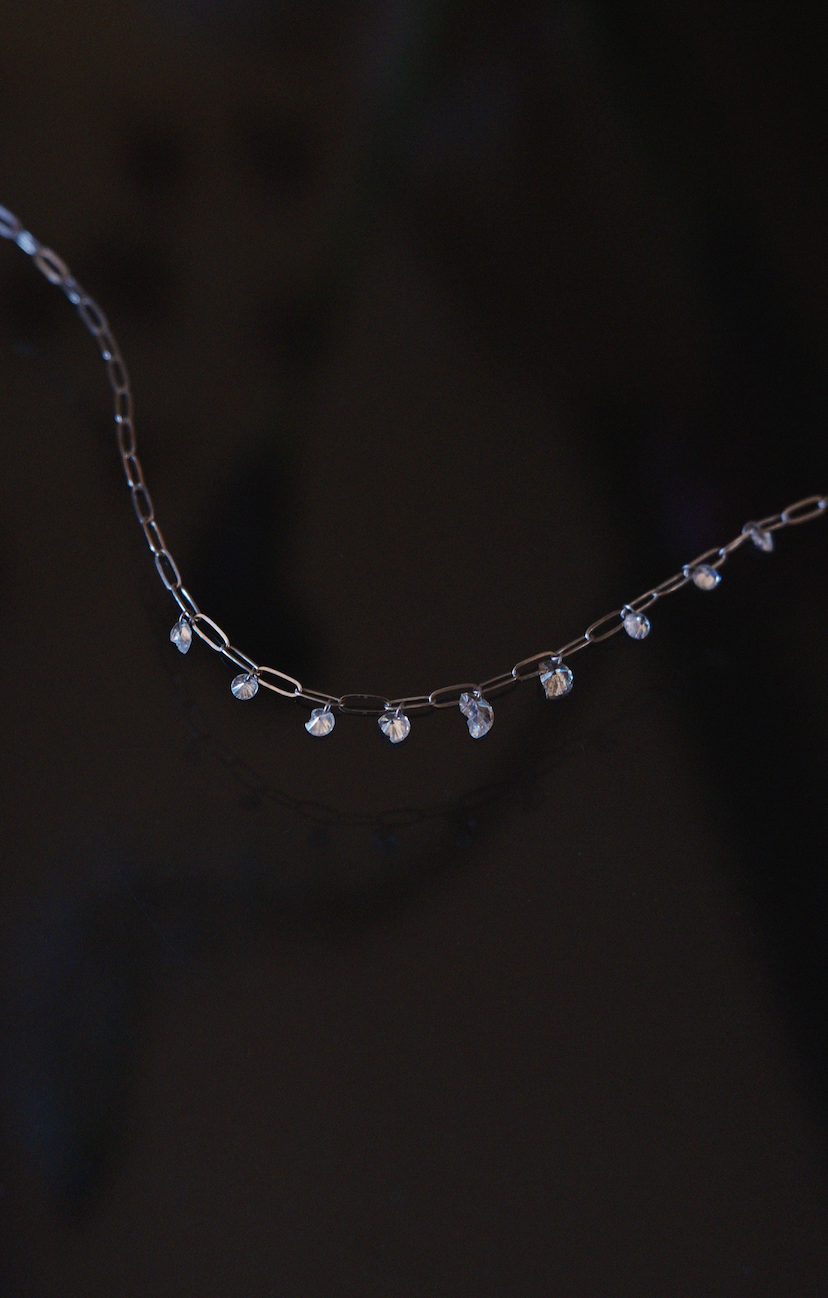 Each Debris Necklace is composed of hand selected reclaimed diamonds, making every piece completely one of a kind. Chosen for their distinctive shapes, the stones are thoughtfully arranged by hand into an intentionally imperfect composition. Laser-pierced and suspended without prongs or bezels, the diamonds appear to float freely, celebrated exactly as they are.
