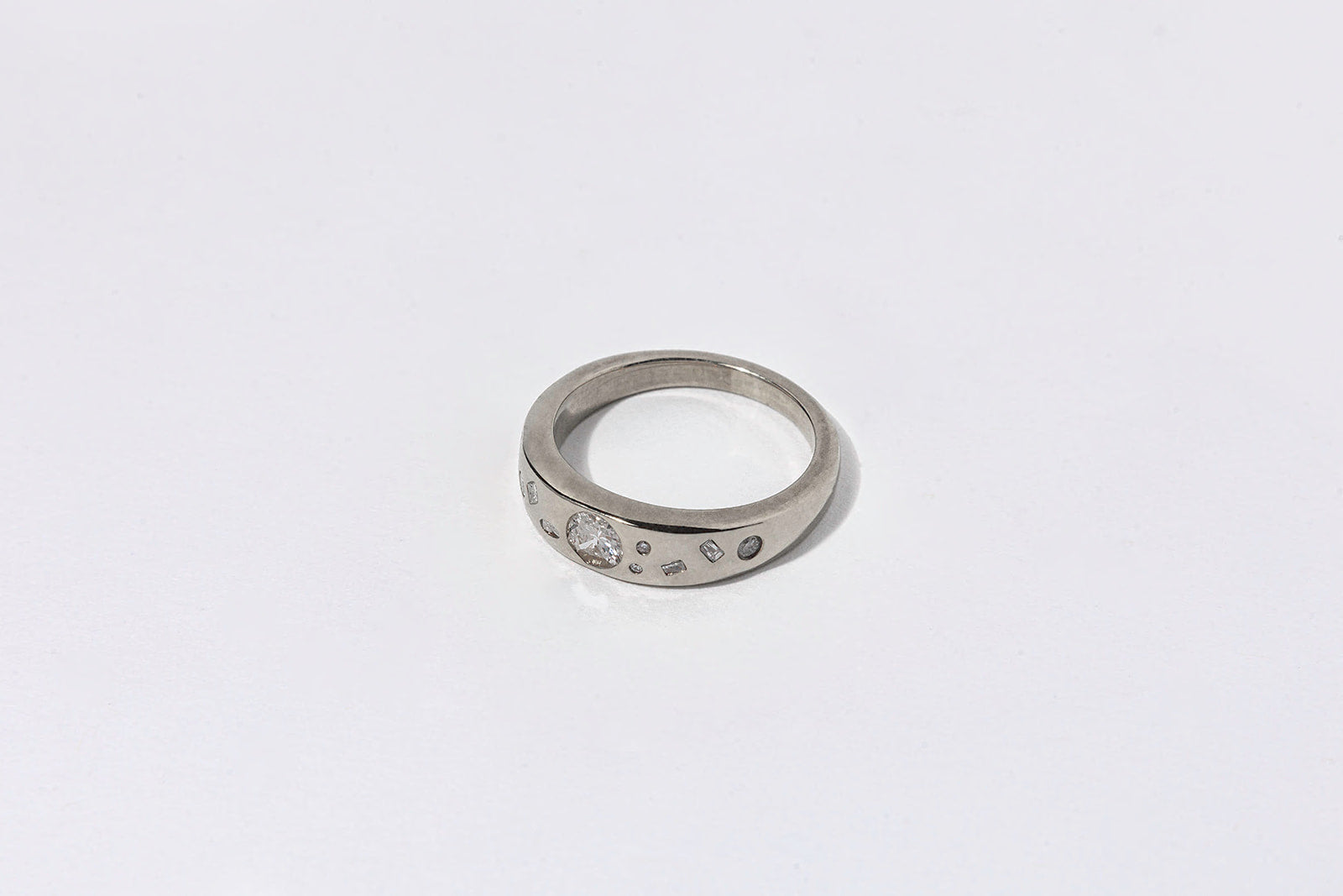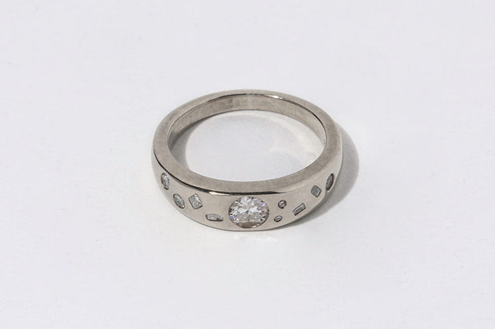 A tapered ring set halfway around with a curated selection of reclaimed in-tact and broken white diamonds in various shapes and sizes. The Stardust Band features a center broken diamond with smaller diamonds sprinkled on each side. One of a kind.