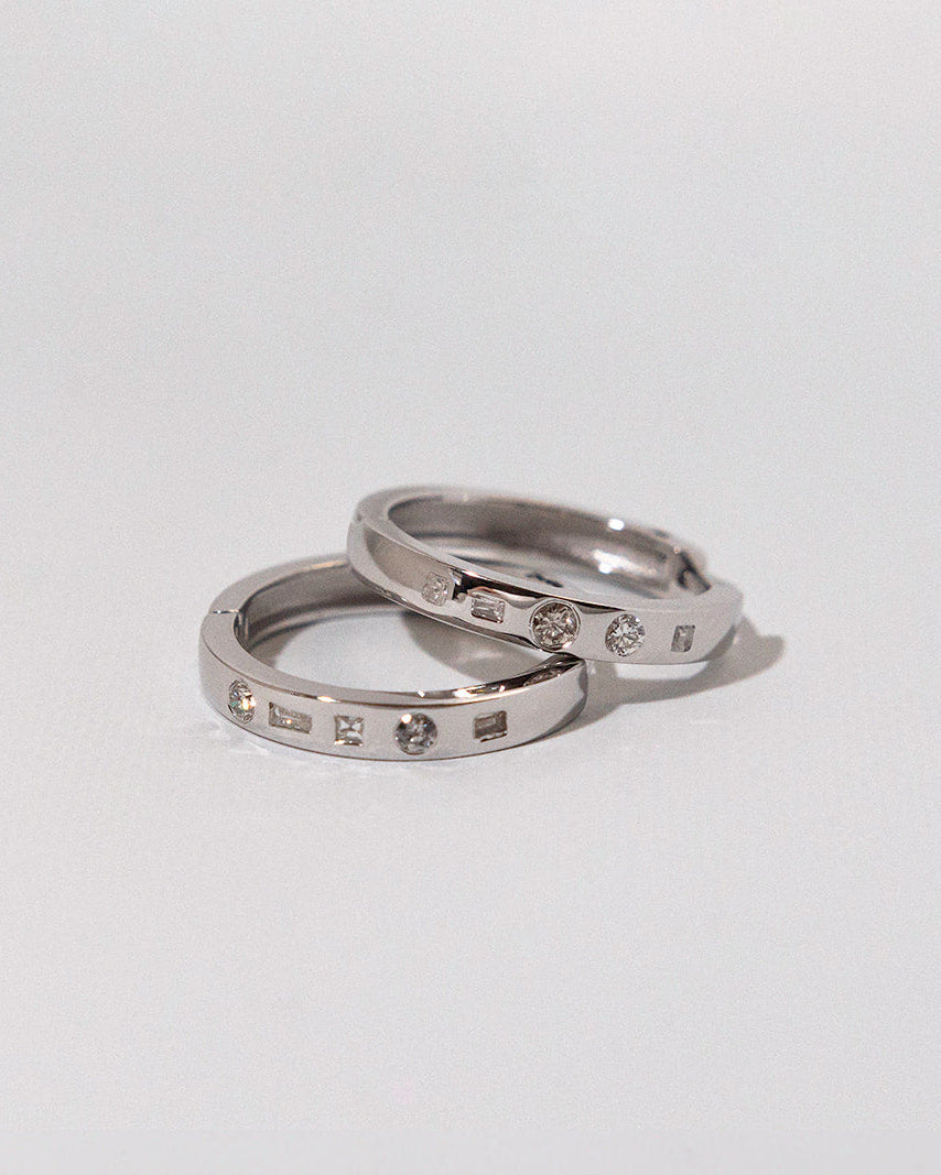 These earrings are the perfect mix of sustainability and luxury. Crafted from recycled metals and adorned with handpicked reclaimed diamonds, each pair is one-of-a-kind and truly special. Each burnish set white diamond is hand selected from broken and intact reclaimed diamonds in an array of shapes, from broken-in-half marquise, to chipped rounds and in-tact baguettes.