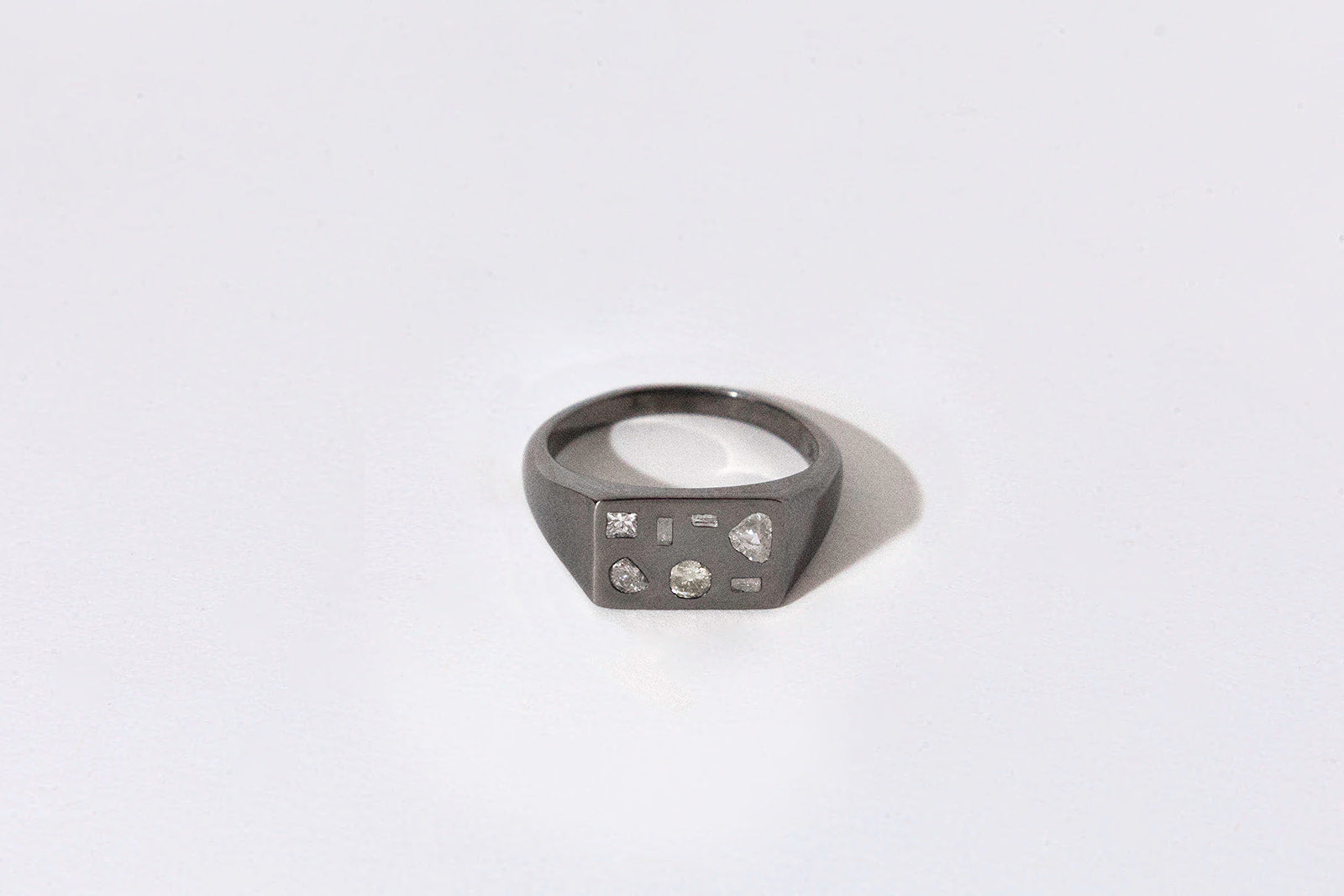 The Debris Signet is a bold ring featuring reclaimed broken diamonds. Handmade in Sterling Silver, 14k gold, or Sterling Silver w/ Black Rhodium plating with all White diamonds or a Black/White/Grey diamond option.