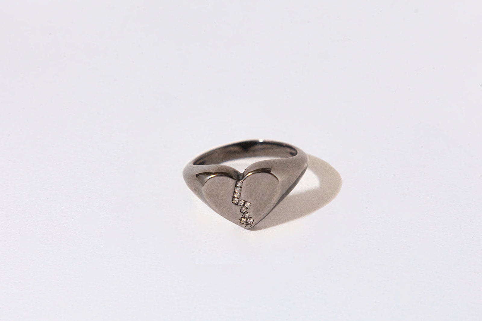 The Broken Heart Signet with white or black diamond pavé down the center.