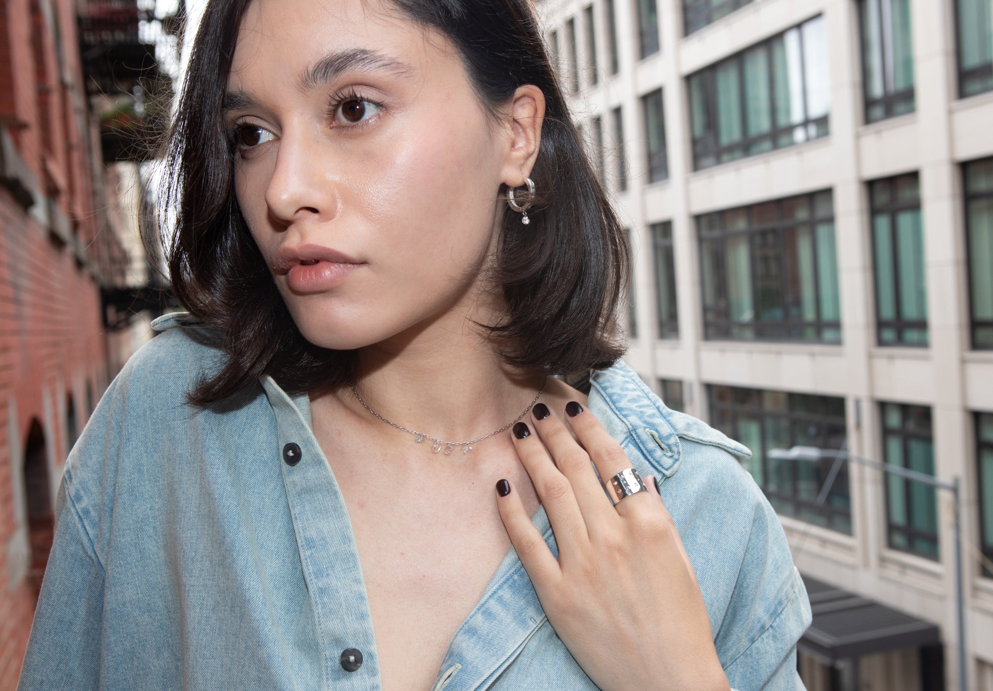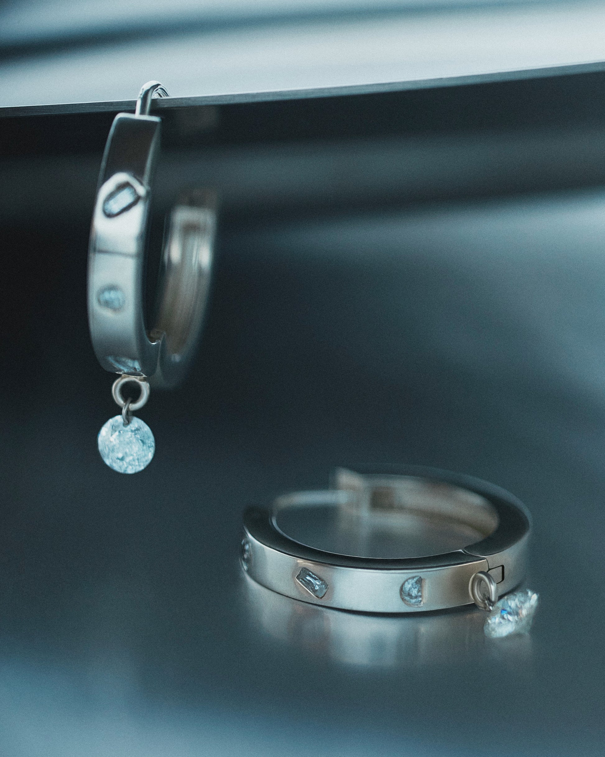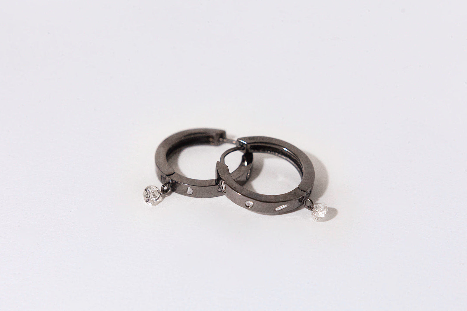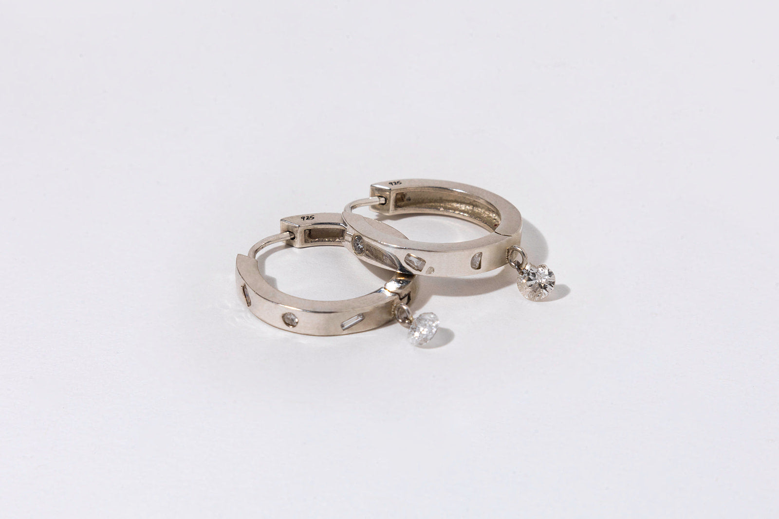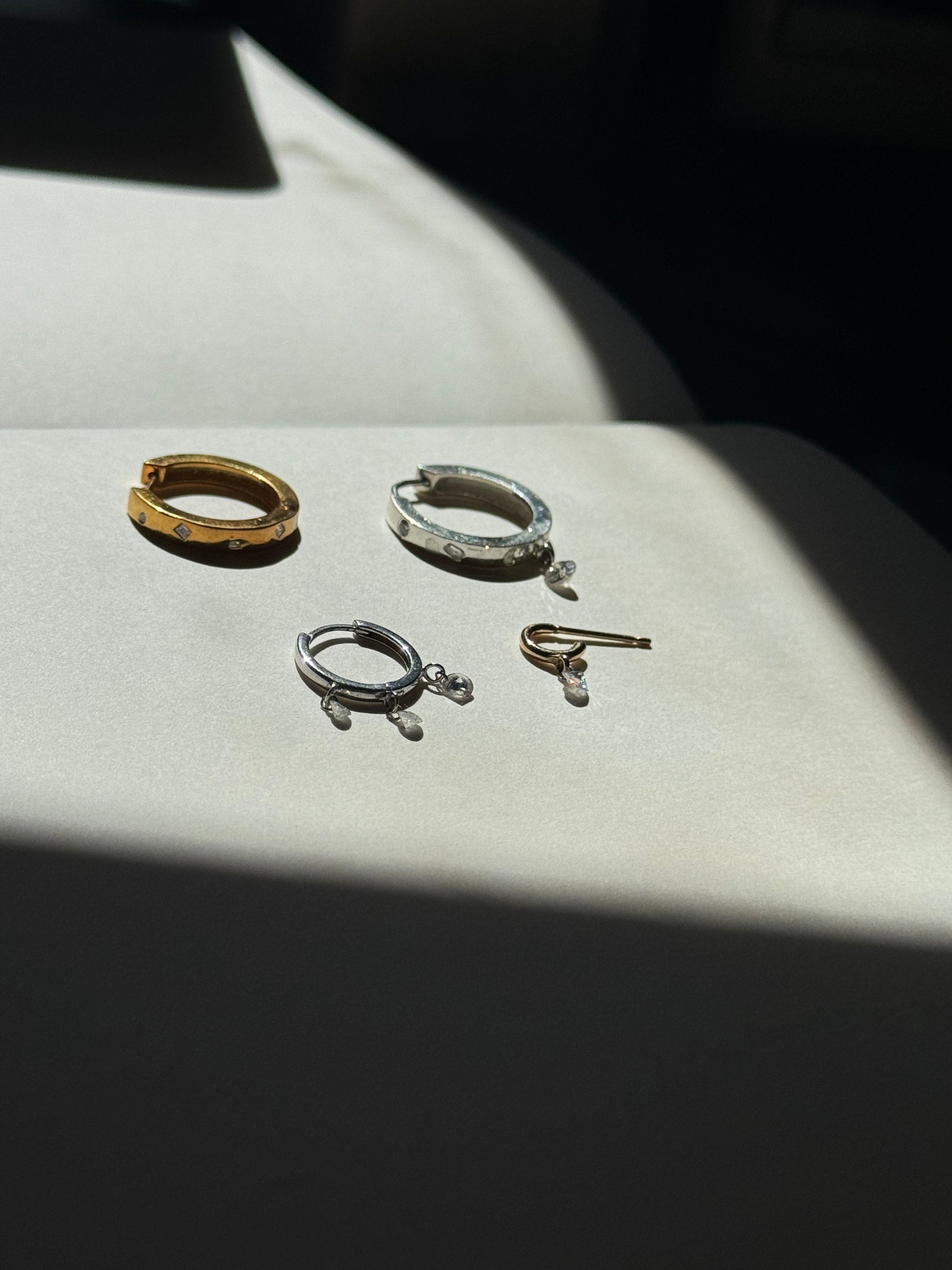The sustainable statement hoops of your dreams. Burnish set with white diamonds. A single broken diamond is pierced and dangles at the bottom adding extra sparkle and movement.